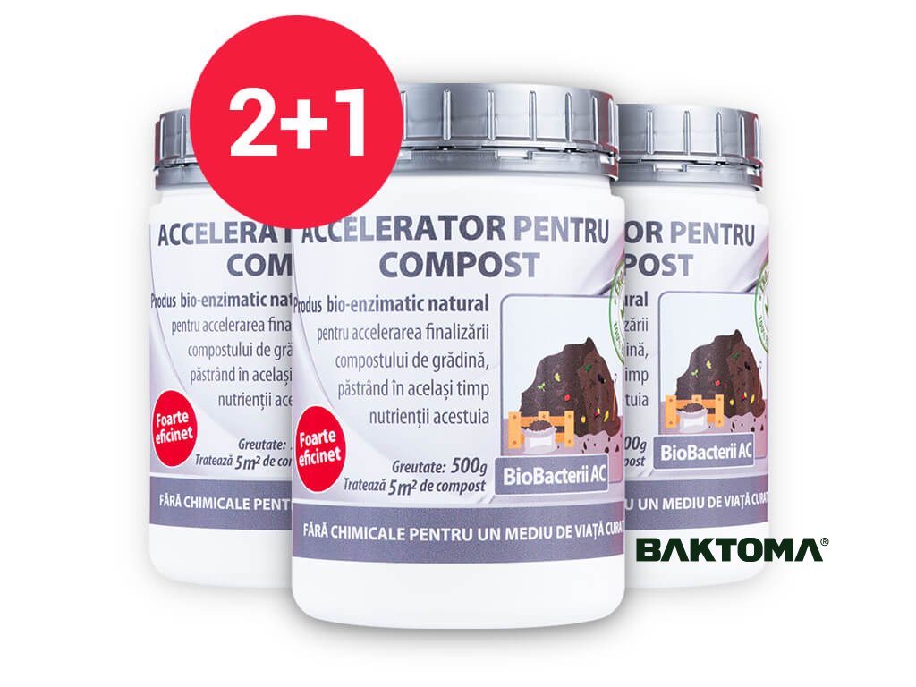 Produs bio-enzimatic natural pentru accelerarea procesul de compostare a compostului de grădină, păstrând în același timp nutrienții. Produsul BioBacterii AC accelerator de compost este un preparatul bio-activ complet natural și ecologic, destinat să ajute o maturizare mai rapidă a compostului. Durata obișnuită a compostării este de un an. Preparatul BioBacterii AC știe să accelereze semnificativ procesul de compostare a deșeurilor de grădină și a deșeurilor biologice selectate din gospodăria dvs. BioBacterii AC este un amestec de culturi bacteriene amestecate cu enzime, emulgatori și substanțe nutritive neprocesate, special concepute pentru compostarea deșeurilor organice (resturi vegetale rămase după tăierea sezonieră a arbuștilor ornamentali - rumegușul din lemn, scoarță, iarbă, frunze, fructe, legume, flori, resturi bio din gospodărie etc.). Prin utilizarea preparatului BioBacterii AC. compostul îşi maximizează valorile de îngrăşământ. Rezultatul aplicării BioBacterii AC este reducerea duratei de compostare.